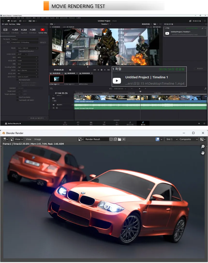 영상편집 S/W 다빈치 리졸브를 이용해 랜더링 테스트를 진행하고 있는 모습으로 (640MB, 920MB, 990MB 4K 동영상을 단일 동영상으로 랜더링, FHD 해상도에 H.264 비디오 코덱) 6분 34초가 소요되는 것을 확인할 수 있었다. 또한 블랜더 랜더링 테스트에서도 2분 39초가 소요되었다. @ 작업용으로도 충분히 사용할 수 있는 빠른 속도를 보여주었다.