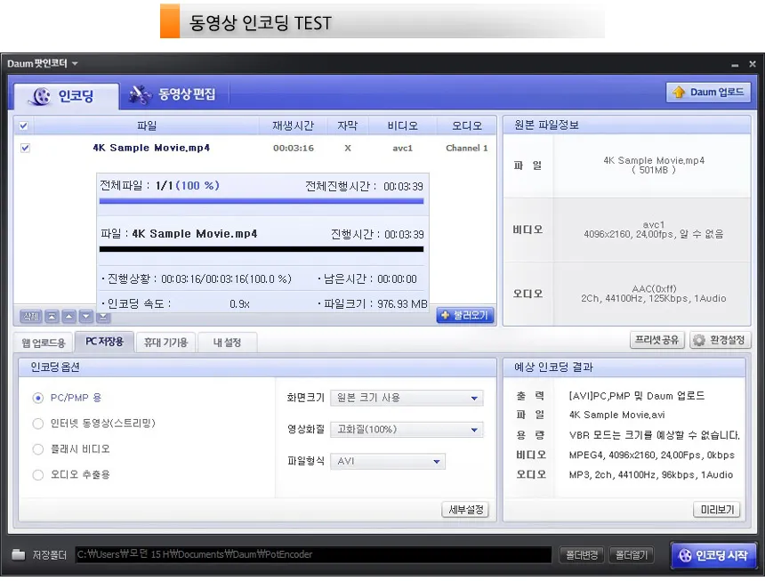 다음 팟인코더를 이용해 4K 동영상의 인코딩 테스트를 진행하고 있는 모습으로 3분 39초의 짧은 인코딩 시간을 보여주었다.