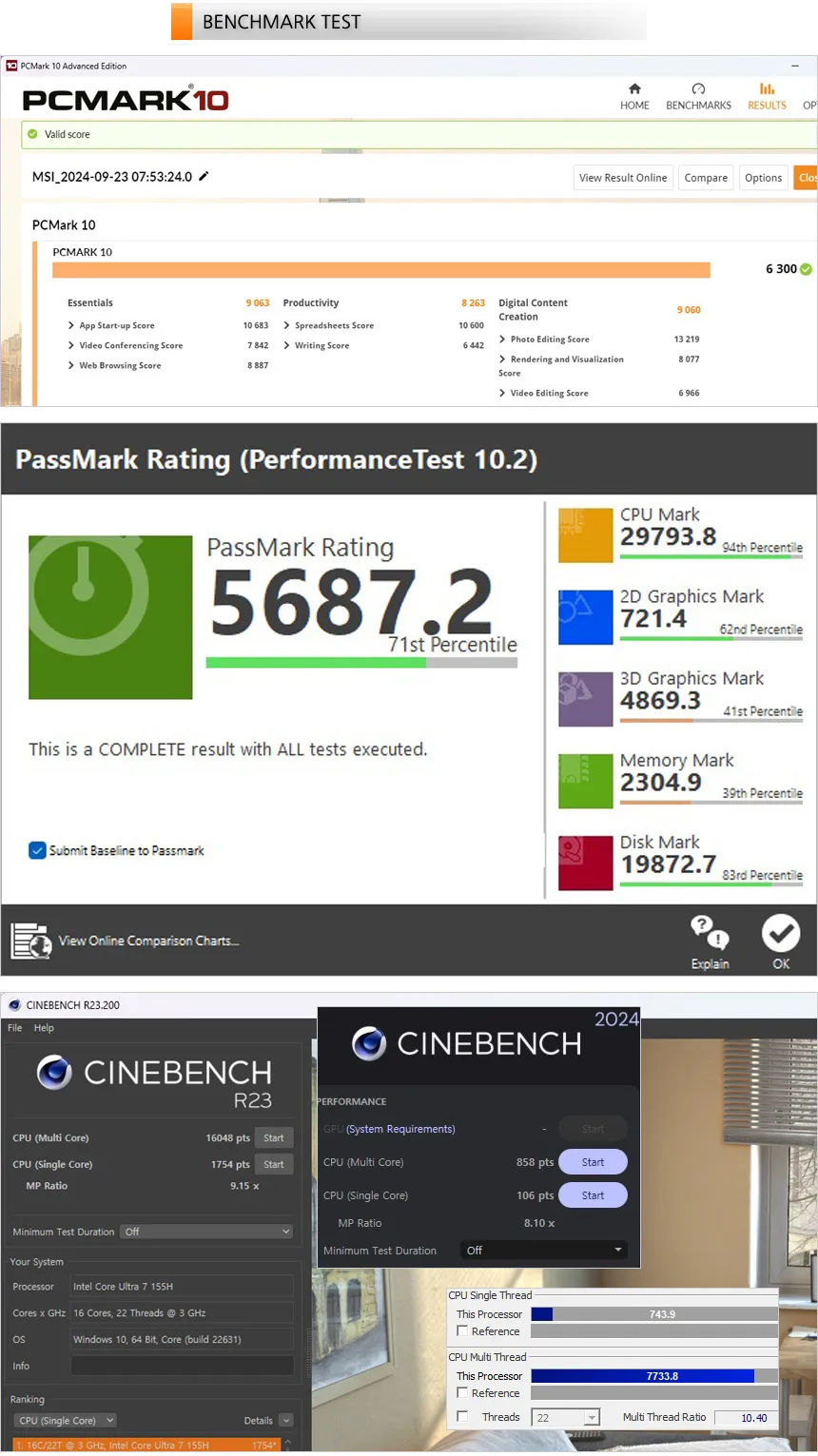 벤치마크 프로그램을 이용해 노트북의 성능을 확인하고 있는 모습으로 낮은 소비전력 대비 높은 성능을 구현하는 인텔코어 울트라 7 155H가 탑재된 노트북 답게 높은 스코어를 보여주었다. 게임은 물론 작업용 노트북으로도 충분히 사용할 수 있을 것이다.