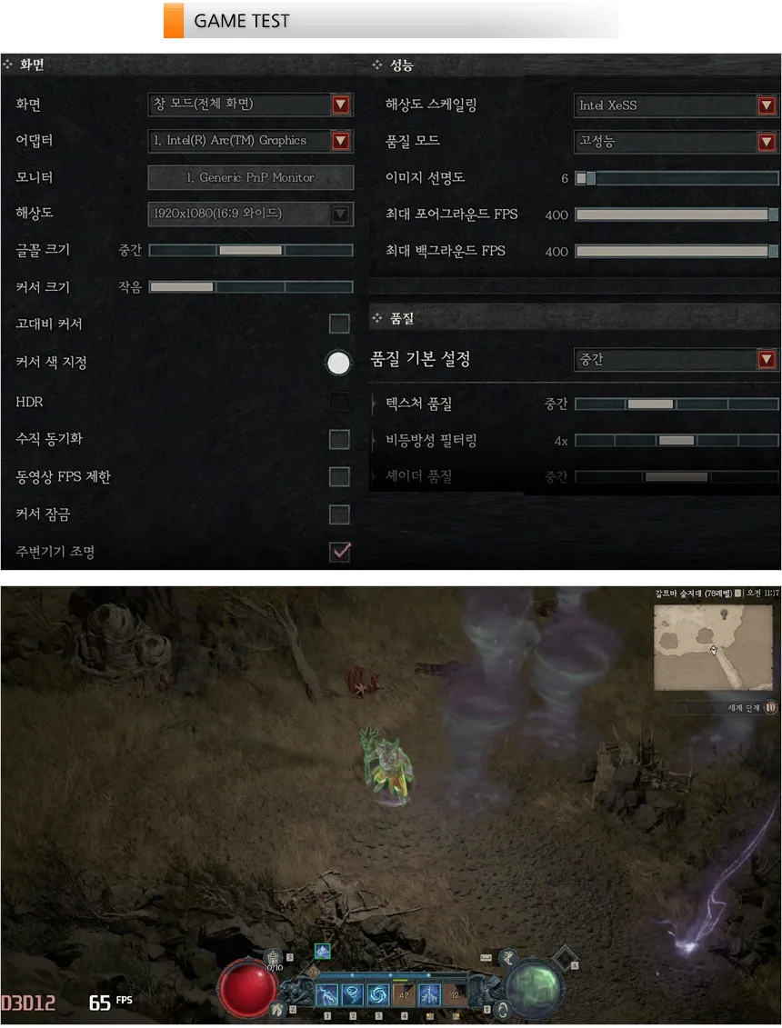 디아블로 4를 중간 옵션에서 플레이 하고 있는 모습으로 (Xess 고성능) 60-74 프레임을 보여주어 부드럽게 게임을 즐길 수 있었다.