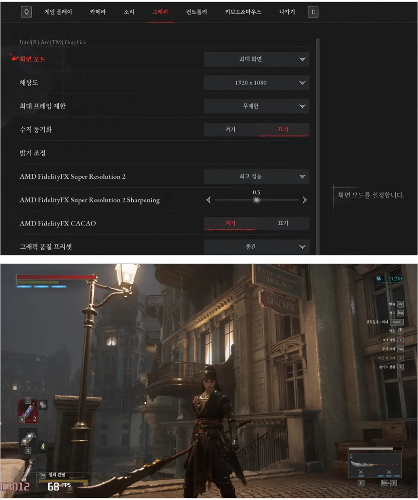 P의 거짓을 중간 옵션으로 플레이 하고 있는 모습으로 (FSR2 최고 성능) 54-71 프레임으로 플레이 되는 것을 확인할 수 있었다. 원활하게 게임을 즐길 수 있을 것이다.