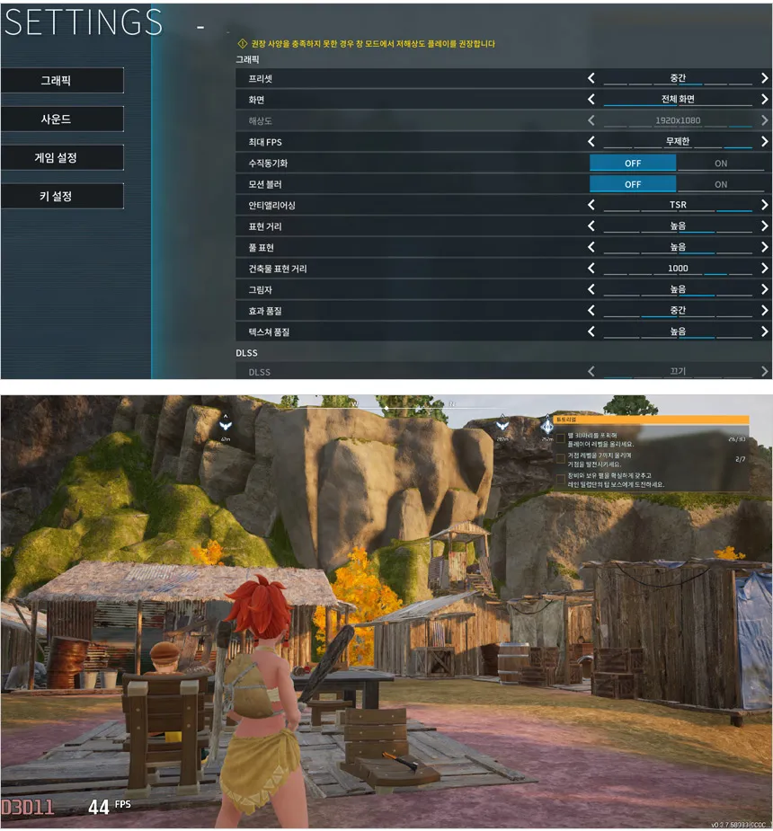 팰월드를 중간 옵션에서 플레이 하고 있는 모습으로 36-54 프레임을 보여주었다. (가능하면 Xess 나 FSR2를 지원하는 게임 위주로 플레이 하기 바란다.)