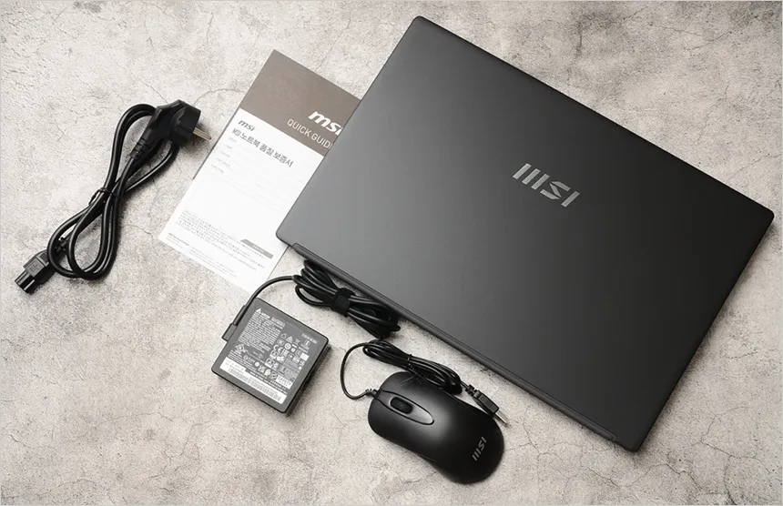 풀KIT 의 모습으로 노트북을 비롯해 90W 전원 어댑터와 전원 케이블이 제공되며 퀵 매뉴얼과 보증서가 포함된 것을 확인할 수 있다. 또한 마우스도 지원해 추가비용 없이 편하게 노트북을 사용할 수 있다.
