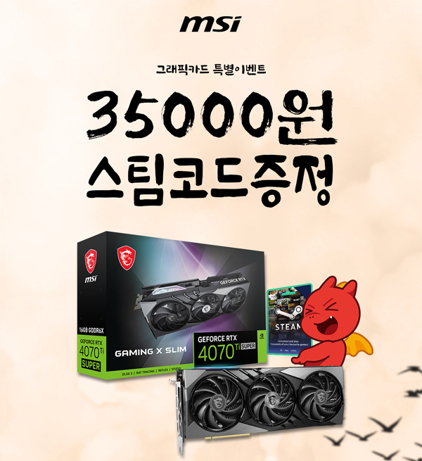 MSI는 MSI 그래픽카드를 구매한 고객들에게 스팀 월렛 35,000원 코드를 증정하는 행사를 진행한다.