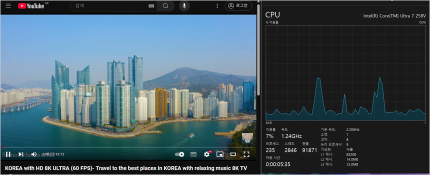 유튜브 고화질 동영상을 이용해 CPU 점유율을 테스트 하고 있는 모습으로 (2160P@60FPS) 6-13% 대의 점유율을 보여 주었으며 인터넷을 실행했을 때 30% 후반까지 점유율이 올라가는 것을 확인할 수 있었다.