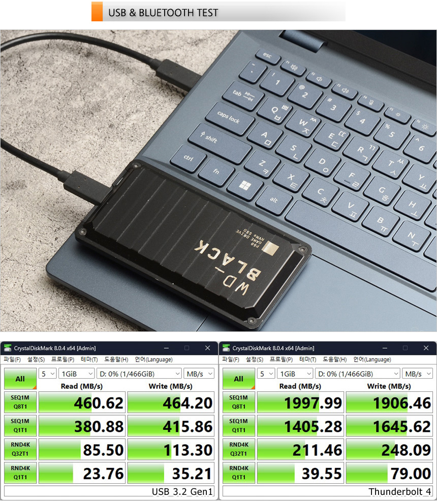 썬더볼트 4 단자를 지원해 빠른 데이터 전송이 가능하다. 상단의 사진은 외장 SSD (USB 3.2 Gen2x2 지원모델) 를 이용해 테스트를 진행하고 있는 모습으로 USB 3.2 Gen1 과 확연한 차이를 보여주는 것을 확인할 수 있다.
