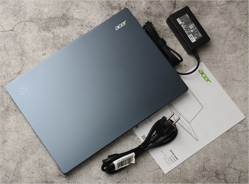 풀KIT 의 모습으로 노트북을 비롯해 C타입의 65W 전원 어댑터와 전원 케이블이 제공되며 퀵 매뉴얼이 포함되어 있다.