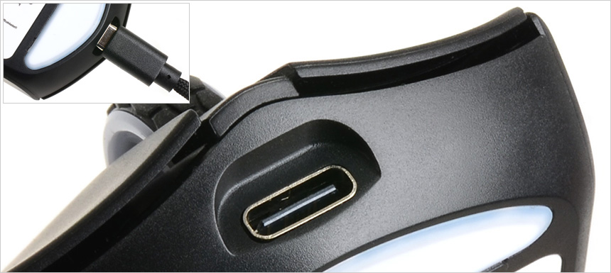 마우스 전면부의 모습으로 유선 연결과 배터리 충전을 위한 C타입 단자가 설치된 것을 확인할 수 있다. 최대 50시간 사용 가능한 300mAh 대용량 내장형 배터리를 지원해 잦은 배터리 교체 등으로 인해 불편을 야기하는 일부 무선 마우스와 달리 편하게 사용할 수 있다. @ 배터리는 PC로 연결해 충전하기 바란다. 스마트폰용 고속 충전기를 사용하면 고장이 발생할 수 있기 때문이다.