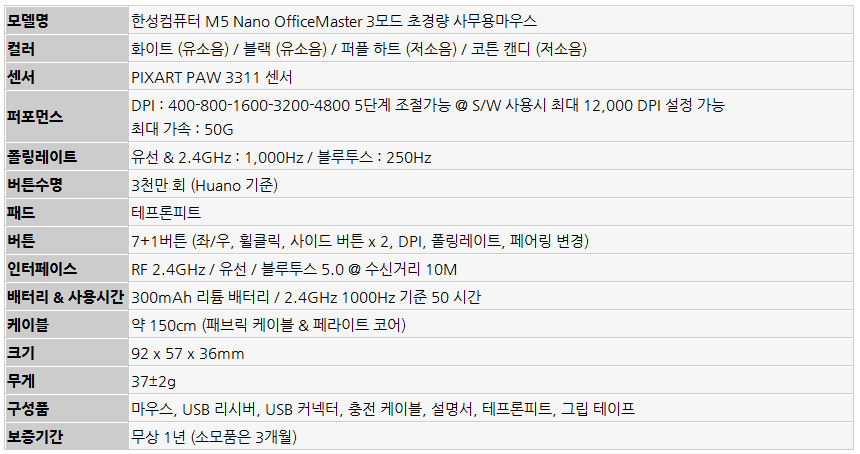 이번에 리뷰를 진행 할 한성컴퓨터 M5 Nano OfficeMaster 3모드 초경량 사무용마우스는 다양한 디바이스에서 사용할 수 있는 초소형 마우스로 손안에 쏙 들어오는 작은 크기에 37g에 불과한 가벼운 무게로 편하게 들고다니며 사용할 수 있다. 특히 유선이나 RF 2.4GHz 만을 지원하는 일반 마우스와 달리 블루투스 기술도 내장되어 스마트폰 이나 태블릿PC와 손쉽게 연결할 수 있다.