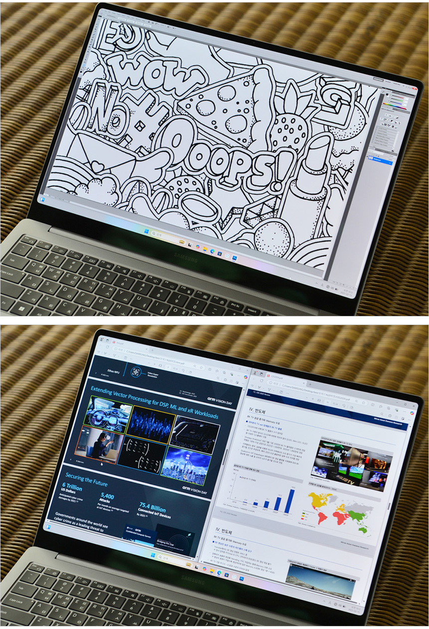 다이나믹 AMOLED 2X 디스플레이를 탑재한 노트북으로 시야각 없는 선명한 영상을 즐길 수 있다. 상단의 사진은 시야각 테스트를 진행하고 있는 모습으로 극단적인 각도에서도 시야각으로 인한 불편은 느껴지지 않았다.