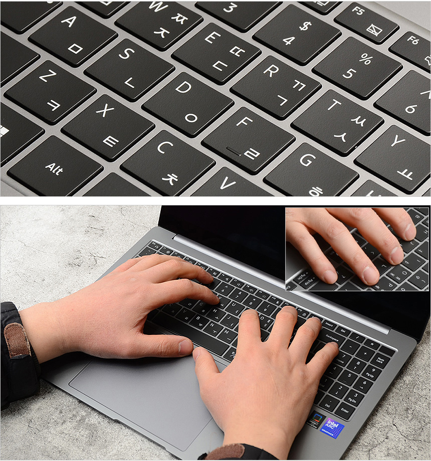 타이핑 테스트를 진행하고 있는 모습으로 키간격이 넓어 오타없는 고속 타이핑이 가능했으며 슬림 키캡 사용으로 깊은 눌림은 제공하지 않지만 구분감은 확연해 눈으로 확인하지 않고도 원할하게 타이핑을 할 수 있었다. 뿐만 아니라 엄청나게 넓은 팜래스트 지원으로 손 뿐만 아니라 손목까지 안정적으로 받쳐놓은 상태에서 편하게 노트북을 사용할 수 있었다.