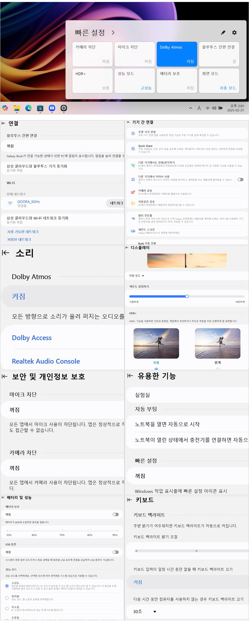 삼성 Settings의 모습으로 (Fn+F1 단축키 제공) 블루투스 연결과 사운드 & 디스플레이 설정이 가능하며 퍼포먼스 설정과 자동부팅, USB 충전, 키보드 백라이트 설정 등을 지원한다. 또한 카메라와 마이크를 차단해 웹캠을 이용한 비주얼 해킹을 원천적으로 막을 수 있다.