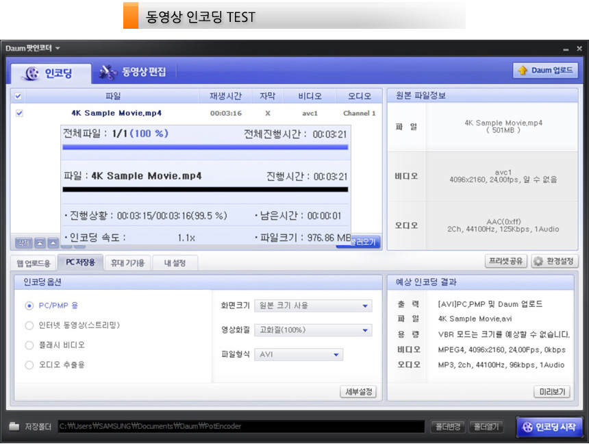 다음 팟인코더를 이용해 4K 동영상의 인코딩을 진행하고 있는 모습으로 3분 21초의 인코딩 시간을 보여주었다.