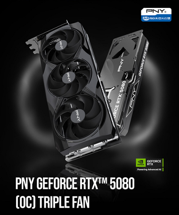 제이씨현시스템은 1년 새제품 교환 서비스가 적용된 NVIDIA Blackwell GPU 아키텍처를 탑재한 PNY GeForce RTX 5080™ 그래픽카드를 출시한다고 밝혔다.