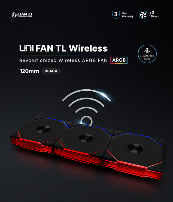 리안리 유니팬 TL 와이어레스 120은 앞서 출시된 유니팬 SL 와이어레스를 잇는 무선 신호를 이용해 RGB 조명과 RPM 컨트롤을 지원하는 제품이다. 제품 규격은 120mm로 동일하나 외형에는 차이를 보인다. 전면부 RGB LED 영역은 더 얇아졌지만 쿨링팬끼리 연결되는 라인을 더 정교하게 다듬어 단차 없이 자연스럽게 이어지는 느낌을 구현했으며, 측면부 전체를 덮고 있는 인피니티 미러(Infinity Mirror)는 0.7mm의 더 얇아진 간격으로 입체감을 크게 강조했다.