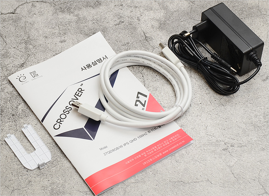 기본 제공되는 액세서리의 모습으로 전원 어댑터와 DP 케이블, 사용설명서, 후면커버 등이 포함된 것을 확인할 수 있다.