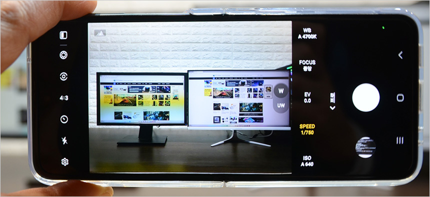 스마트폰을 이용하면 모니터의 플리커 현상을 확인할 수 있다. (카메라 모드를 프로로 설정하고 셔터스피드 1/300 이상으로 셋팅) 테스트용 모니터는 플리커 현상이 발생하는데 반해 크로스오버 27QD9GW는 깜빡임 없이 부드러운 영상을 재생해 주었다. (동영상에서 자세히 확인할 수 있다.)