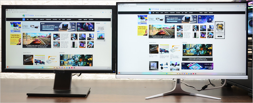 두 대의 모니터를 셋팅한 김에 패널과 베젤 두께를 비교해 보았는데 사진과 같이 큰 차이가 발생하는 것을 확인할 수 있다. 이 제품은 3면 슬림 베젤을 적용해 높은 몰입감을 경험할 수 있다.
