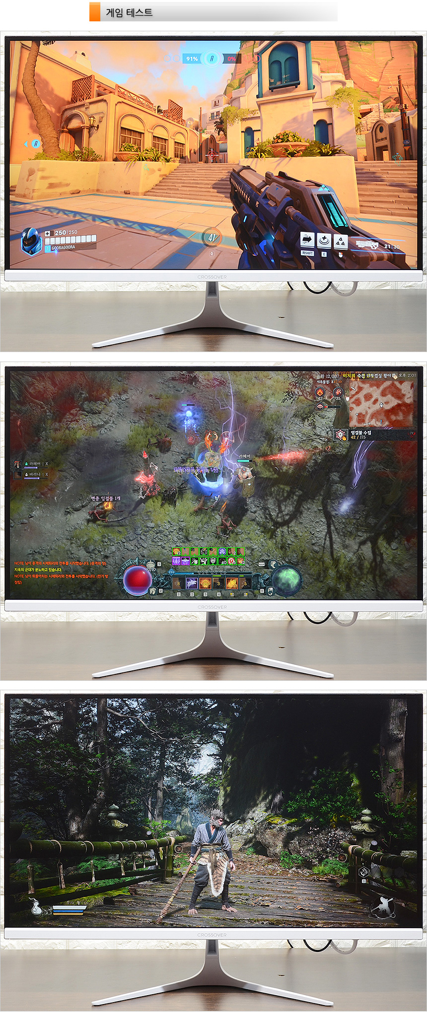 게임 테스트를 진행하고 있는 모습으로 IPS 패널 특유의 강렬한 색감이 돋보였으며 27형 대화면에 슬림 베젤이 적용되어 높은 몰입감을 선사했다. 밝기도 높고 블랙레벨 기술도 지원해 어떤 맵에서도 명확하게 캐릭터와 배경을 구분할 수 있었으며 조준선을 지원해 사격 정확성을 높일 수 있었다.