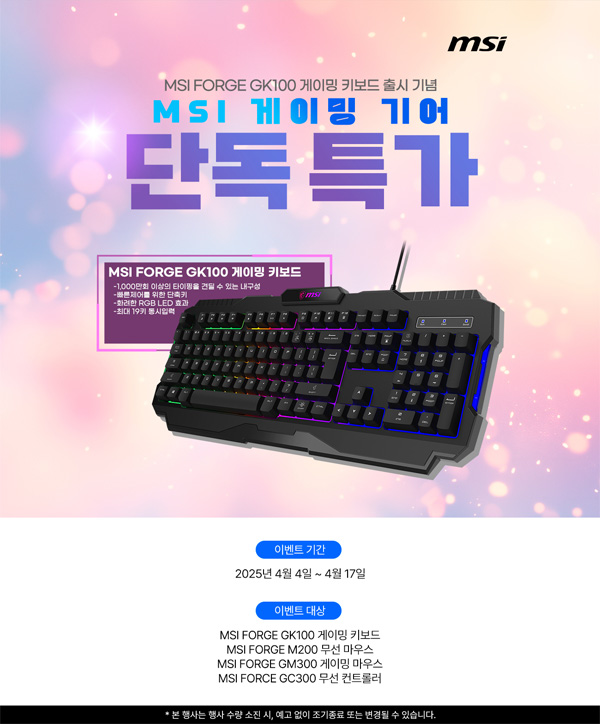 이번 행사는 2025년 4월 17일까지 진행된다. 4월 구매자들은 2025년 5월 15일까지 이벤트를 신청할 수 있다. 이벤트 대상 제품은 MSI FORGE GK100 게이밍 키보드, MSI FORGE GM300 게이밍 마우스, MSI FORGE M200 무선 마우스, MSI FORCE GC300 무선 게이밍 컨트롤러가 포함된다.