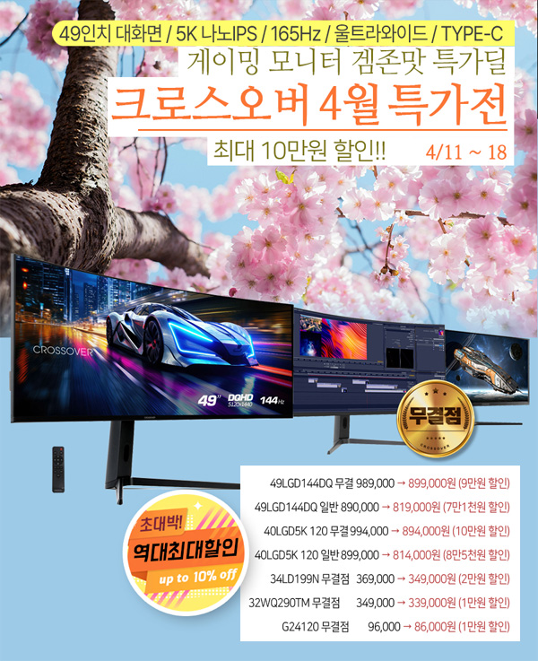 이번 행사동안 크로스오버의 24, 32, 34, 40, 49형 등 다양한 모니터를 구입하면 최대 10만원 파격할인을 실시한다.