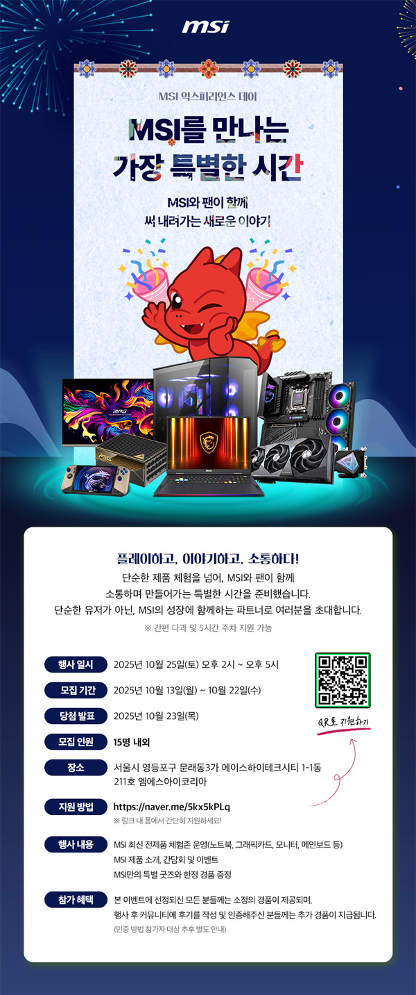 MSI는 오는 10월 25일(토) 서울 영등포구 문래동에 위치한 MSI 코리아에서 ‘MSI 익스피리언스 데이(MSI Experience Day)’를 개최하고, 오프라인 체험 행사에 참여할 참가자 15명 내외를 모집한다고 밝혔다.