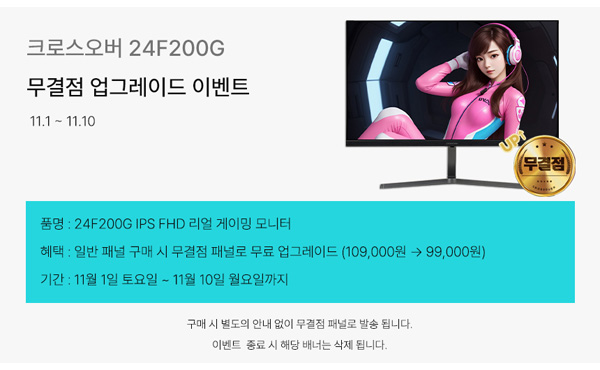 크로스오버가 24형 FHD 144Hz를 지원하는 게이밍 모니터 ‘크로스오버 24F200G IPS FHD 리얼 게이밍’을 대상으로 무결점 무료 업그레이드 이벤트를 진행한다.