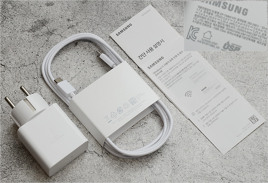 기본 제공되는 액세서리의 모습으로 65W 전원 어댑터와 USB 케이블, 퀵 매뉴얼이 포함되어 있다.