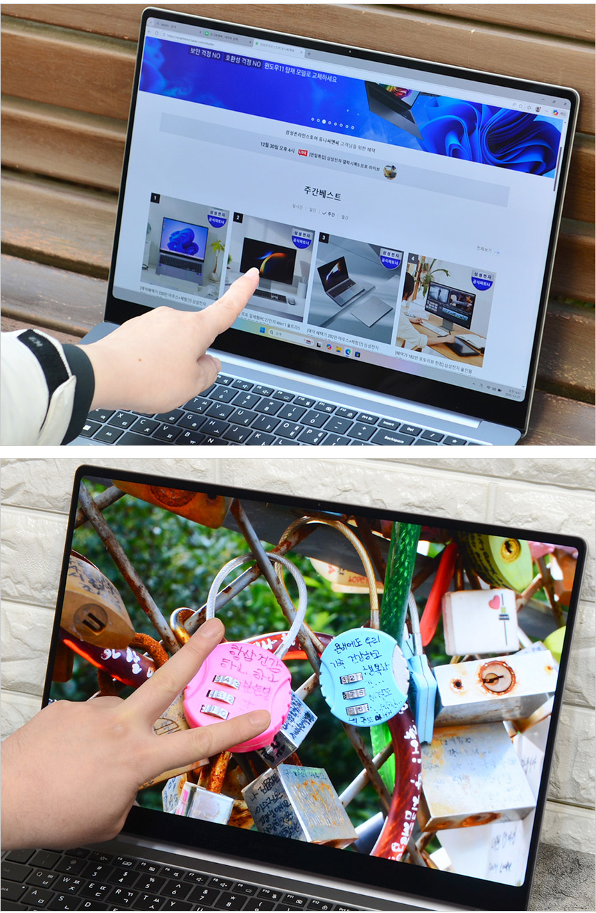 일반 노트북과 달리 터치를 지원해 편의성을 높인점도 큰 특징이라 할 수 있다. 마우스를 사용하기 힘든 외부에서 마우스 수준의 빠른 조작이 가능하며 AI 셀렉트와 같은 터치에 특화된 프로그램을 편하게 사용할 수 있다. @ 참고로 터치인식 테스트을 진행했는데 핑거 터치로 부드럽게 노트북을 조작할 수 있었으며 터치펜을 사용하면 강의실에서 간단한 필기도 가능했다.
