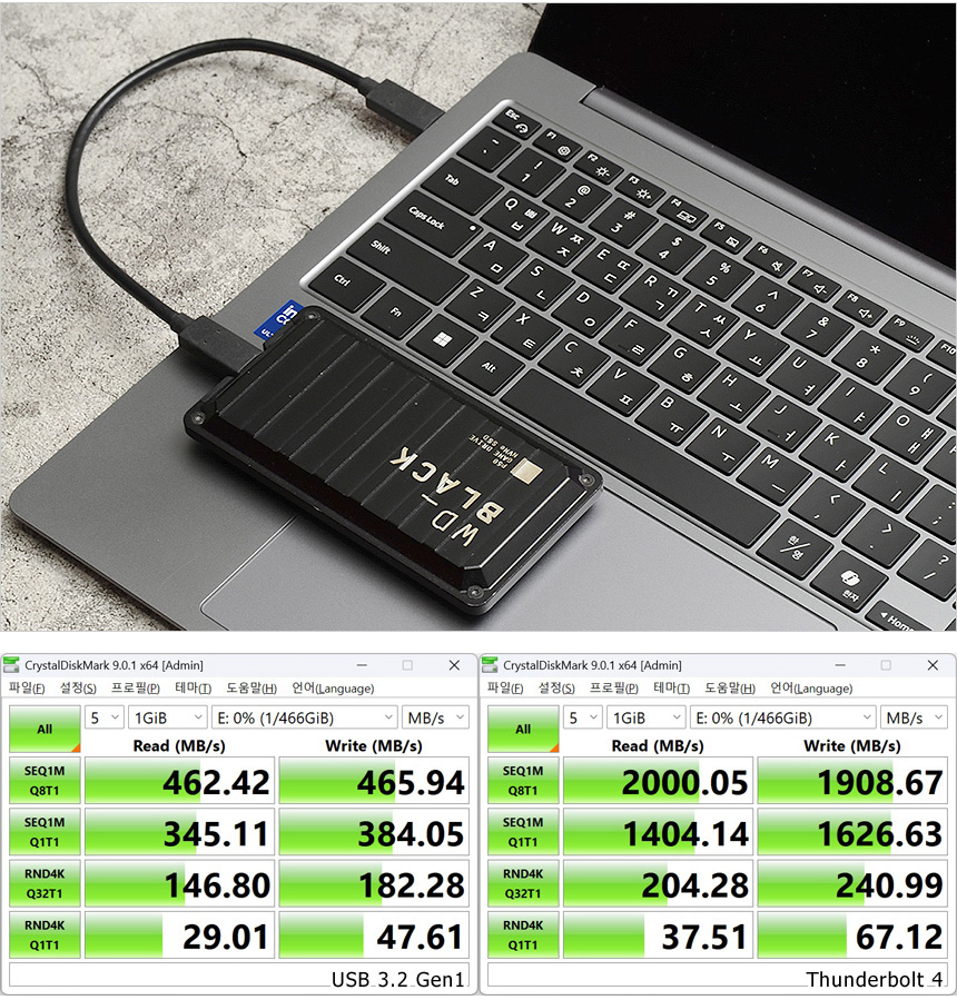 썬더볼트 4 단자를 지원해 빠른 데이터 전송이 가능하다. 상단의 사진은 외장 SSD (USB 3.2 Gen2x2 지원제품) 를 이용해 테스트를 진행하고 있는 모습으로 USB 3.2 Gen1과 확연한 차이를 보여주었다. 대용량 데이터 전송이 잦은 유저들이라면 만족하며 사용할 수 있을 것이다.