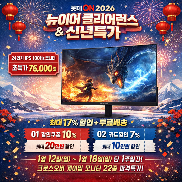 크로스오버는 자사의 인기 게이밍 모니터 22종을 대상으로 롯데온 2026년 1월 뉴이어 클리어런스 & 신년특가 프로모션을 진행한다고 밝혔다.