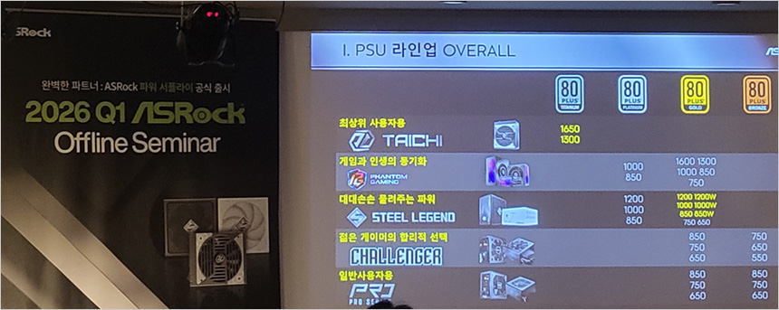 PC 부품 전문 브랜드 애즈락에서 파워 서플라이이 공식 출시를 기념해 오프라인 세미나를 진행했다. 용산 전자랜드 신관2층 랜드홀에서 진행된 이번 세미나에서는 국내 정식 출시될 고급형 파워서플라이 라인업인 타이치와 스틸레전드 제품들의 소개를 비롯해 메인스트림급 메인보드 시장에 특화된 ROCK 시리즈 메인보드에 대한 발표가 있었다.