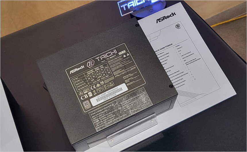 상단의 사진은 애즈락의 최상급 파워 서플라이 타이치 1650W 플래티넘의 모습으로 모델명과 같이 80+ 플레티넘 인증을 획득했으며 사이버네틱스 티타늄과 람다 A+ 인증을 획득했다. ATX3.1 및 PCIe5.1 지원으로 최신 하이엔드 시스템과 완벽 호환되며 풀모듈러 방식을 적용해 편의성을 높였다.