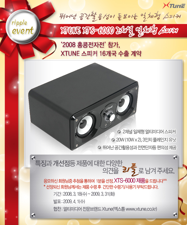 지난 3월 31일까지 진행되었던 '일체형 스피커 XTUNE-6000'에 대한 리플 이벤트 결과를 아래와 같이 발표합니다.