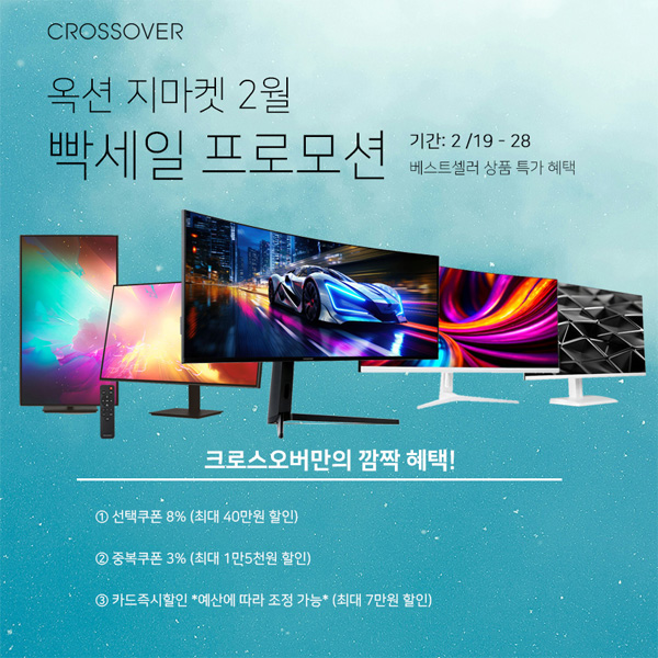 크로스오버는 자사의 인기 게이밍, 고해상도 모니터들을 대상으로 옥션 지마켓 2026년 2월 빡세일 프로모션을 실시한다.