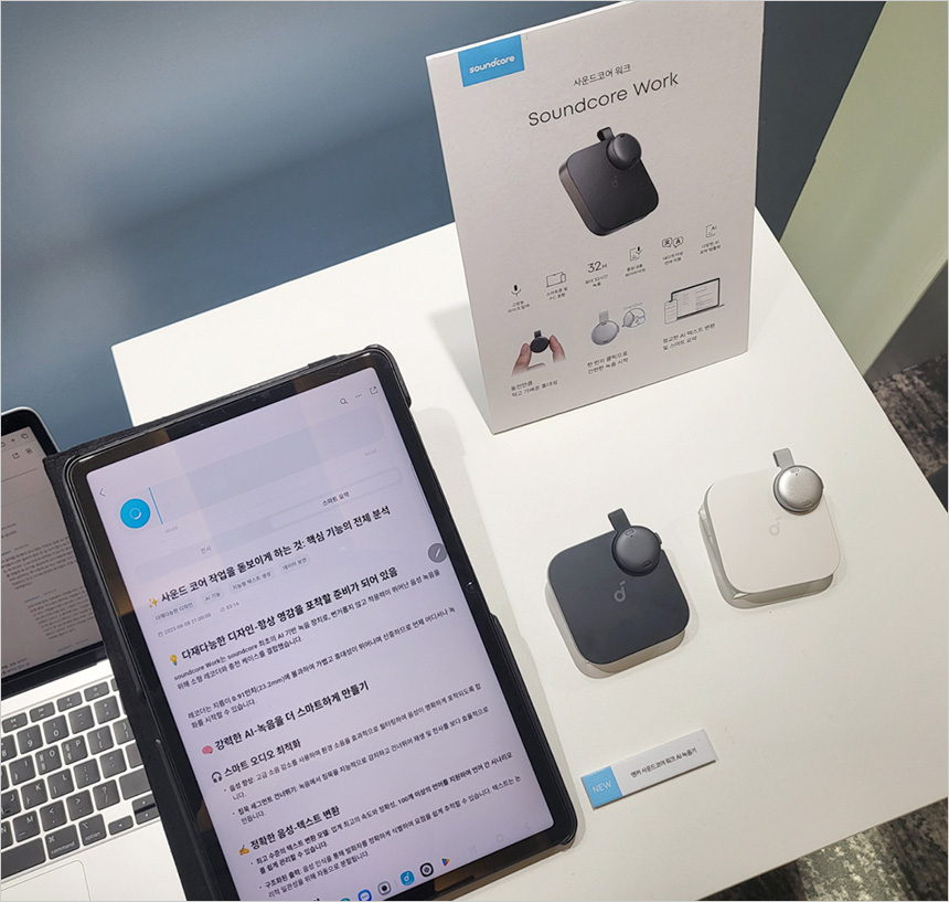 ‘앤커 사운드코어 AI녹음기’는 AI를 기반으로 텍스트 변환 및 요약 기능을 제공하는 웨어러블 녹음기로 회의나 인터뷰 등의 음성을 원클릭으로 녹음한다. 10g의 초경량 무게와 세계 최초 동전 크기의 초소형 사이즈로 최대 5m 거리까지의 음성을 수집하며, 최대 32시간 연속 녹음이 가능하다. 대화 주체를 식별하고 GPT-5를 기반으로 한국어를 포함한 140개 이상의 언어를 정확하게 변환한다. 모바일은 물론 PC에서도 데이터를 확인하고 편집할 수 있으며, 상황에 맞는 템플릿을 적용해 회의록을 자동으로 작성함으로써 업무 효율을 향상시킨다.