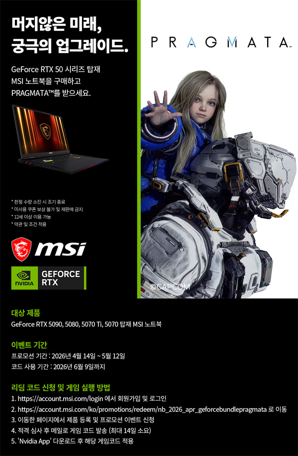 MSI는 NVIDIA GeForce RTX™ 50 시리즈 그래픽을 탑재한 MSI 노트북 구매 고객을 대상으로 캡콤의 신작 ‘프래그마타(PRAGMATA™)’ 게임 코드를 증정하는 프로모션을 진행한다고 밝혔다.