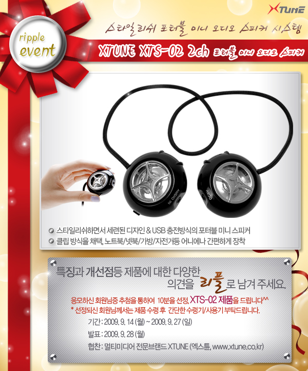 지난 9월 27일까지 진행되었던 'XTUNE XTS-02tok' 모바일 스피커에 대한 리플 이벤트 결과를 아래와 같이 발표합니다. 참여해 주신 모든 회원 님들께 진심으로 감사드립니다.