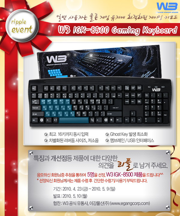 지난 5월 10일까지 진행되었던 'W3 IGK-8500' 게이밍 키보드의 리플 이벤트 결과를 아래와 같이 발표합니다. 참여해 주신 모든 회원 님들께 진심으로 감사드립니다.