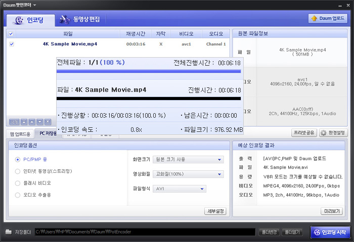 다음 팟인코더를 이용해 4K 동영상의 인코딩을 진행하고 있는 모습으로 6분 18초가 소요되는 것을 확인할 수 있었다. (6세대 인텔코어 프로세서 탑재모델 대비 30초 이상 빠른 인코딩 시간을 보여주었다.)