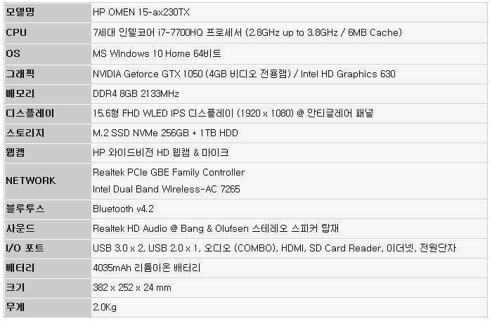 이번에 리뷰를 진행 할 HP OMEN 15-ax230TX 는 GTX 1050을 탑재한 게이밍 노트북으로 동급 제품대비 화려한 스펙을 보여주고 있다. 7세대 인텔코어 프로세서 i7-7700HQ를 비롯해 256GB NVMe SSD 가 탑재되어 있어 더 쾌적한 노트북 사용이 가능한 장점이 있다. 여기에 OMEN 노트북 특유의 고급스러운 디자인을 그대로 계승하고 있다.