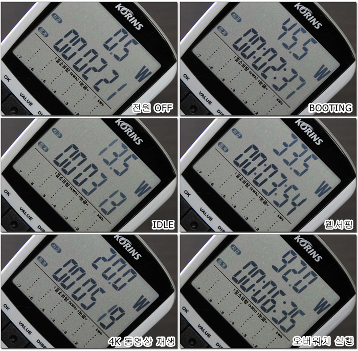 소비전력 테스트를 진행하고 있는 모습으로 전반적으로 하이엔드 게이밍 노트북 대비 낮은 전력소모를 보이는 것을 확인할 수 있었다. (GTX 1060을 탑재한 게이밍 노트북의 오버워치 소비전력은 약 130W 이다.)