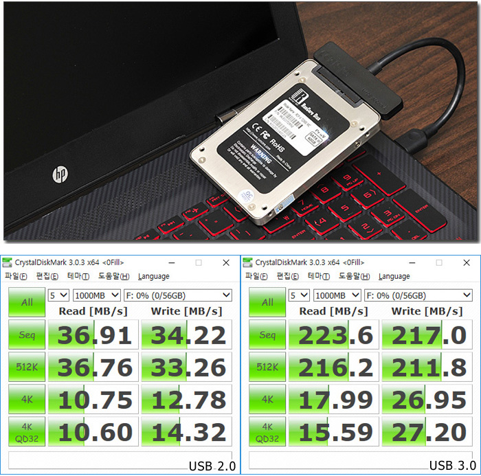 2개의 USB 3.0 단자를 지원해 빠른 데이터 전송이 가능하다. 상단의 사진은 USB 2.0 과의 속도 테스트를 진행한 모습으로 상당한 차이가 발생한 것을 알 수 있다.