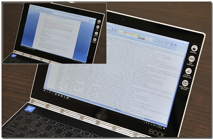 이번에 리뷰를 진행 할 레노버 YOGA BOOK Pro 는 유저들에게 단점으로 지적되던 저장용량을 획기적으로 늘리고 윈도우 10 Pro 탑재로 사용성을 한층 높인 제품으로 다양한 용도로 활용할 수 있다. 기존과 같이 일반 노트북은 물론 태블릿PC 형태로 사용할 수 있으며 새로운 입력 형태인 크리에이트 패드를 지원해 필기된 내용을 바로 디지털 화 할 수 있다.