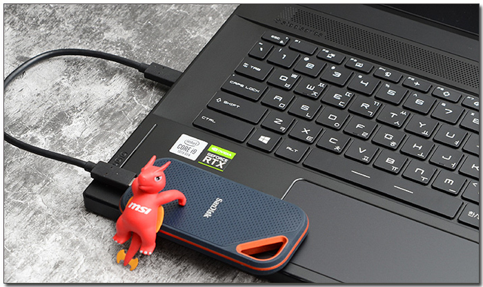 이 제품은 썬더볼트 3 단자와 3개의 USB 3.2 Gen2 단자를 지원해 빠른 데이터 전송이 필요할 경우 유용하게 활용할 수 있다. 상단의 사진은 USB 3.2 Gen2 외장 SSD를 이용해 테스트를 진행하고 있는 모습으로 1,000MB/s을 넘어가는 빠른 속도를 보여 주었다.