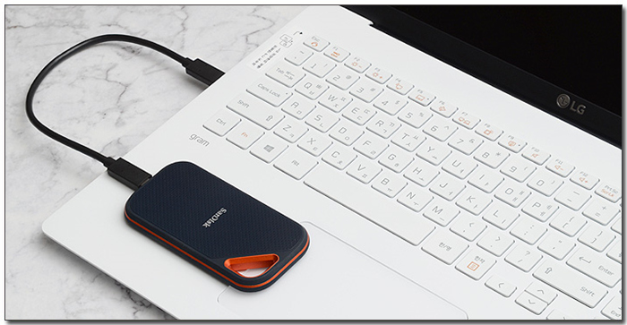 이 제품은 보급형 노트북과 달리 USB 3.2 Gen2 단자를 지원해 빠른 데이터 전송이 가능하다. 상단의 사진은 외장 SSD를 이용해 테스트를 진행하고 있는 모습으로 USB 3.2 Gen1과 과는 확연한 차이를 보여주었다.