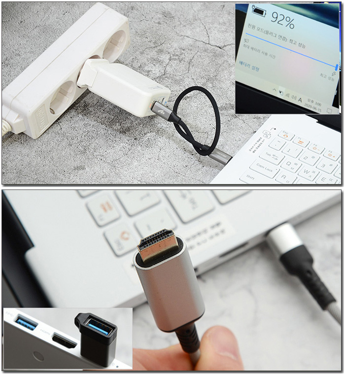 썬더볼트 3 단자는 상시전원을 지원해 노트북이 꺼진 상태에서도 스마트폰 충전이 가능하다. (LG 컨트롤 센터에서 USB 상시전원 설정을 할 수 있다.) 상단의 사진은 충전 테스트를 진행하고 있는 모습으로 고속충전이 지원되는 것을 확인할 수 있었다. 회사나 집에서 굳이 충전기를 찾아다닐 필요가 없다.