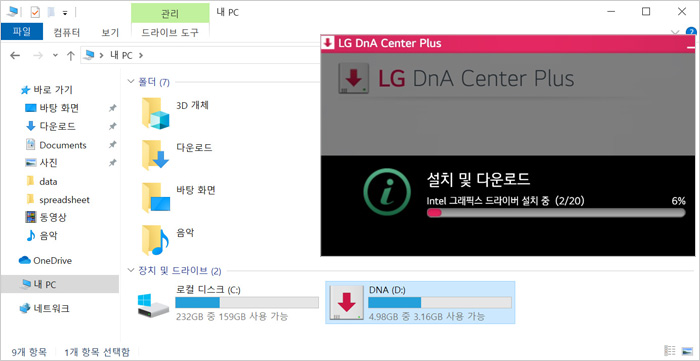 LG 노트북은 윈도우가 설치되지 않은 제품에 DnA Center Plus를 제공해 설치 편의성을 높였다. OS설치후 프로그램을 실행하면 자동으로 드라이버와 S/W를 설치해 편하게 노트북을 사용할 수 있다. (OS 설치시 D드라이브는 건드리지 말기 바란다.)