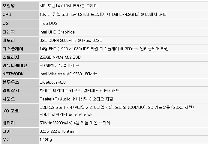 이번에 리뷰를 진행 할 MSI 모던14 A10M-i5 카본 그레이 는 학습이나 업무용 노트북으로 딱 어울리는 모델이다. 10세대 인텔코어 프로세서를 탑재해 대부분의 작업을 쾌적하게 실행할 수 있으면서도 무게는 1.18Kg 에 불과해 손쉽게 들고 다니며 사용할 수 있기 때문이다.