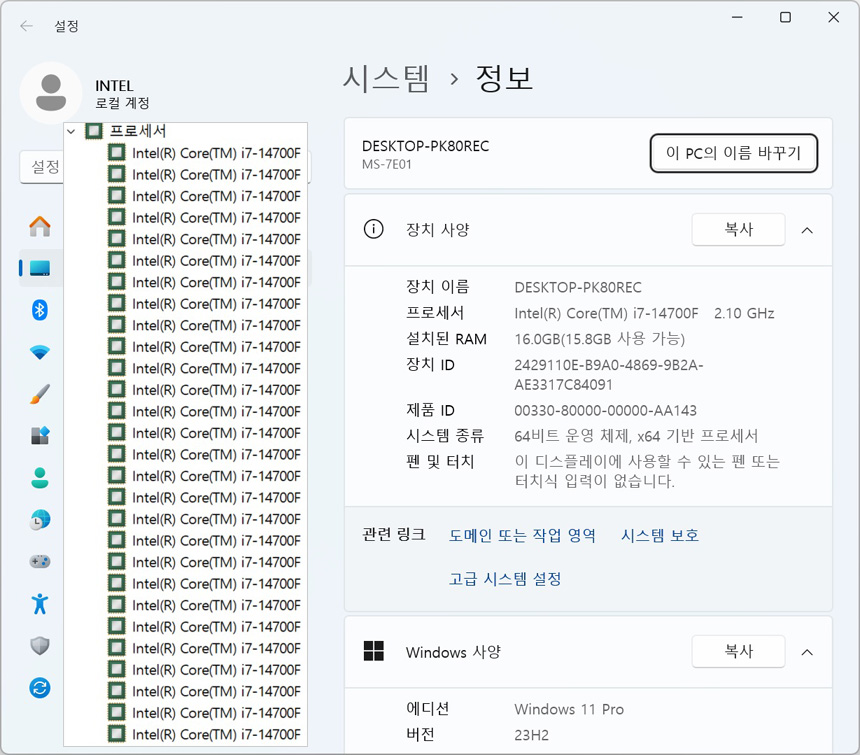 OS와 드라이버 설치후 시스템 정보를 확인하고 있는 모습으로 8개의 성능코어와 효율코어로 구성된 것을 확인할 수 있으며 E코어가 4개 추가되어 장치관리자에서 28개의 프로세서로 표시되는 것을 확인할 수 있다. (성능코어는 1코어가 2개의 스레드로 인식)